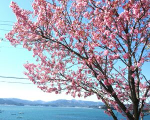 青い空と碧い海、桜のピンクとこぶしの花の白が春色を添え、足元には可愛らしい水仙の花。