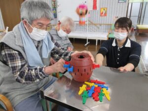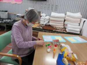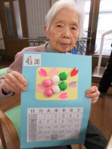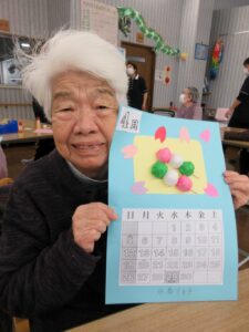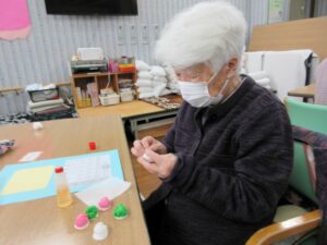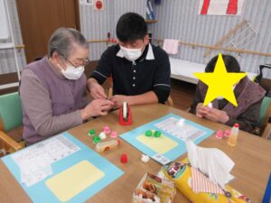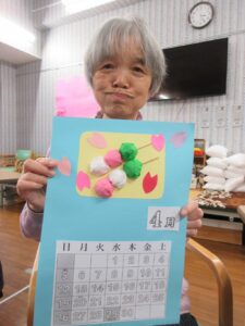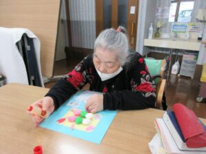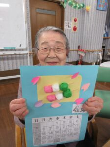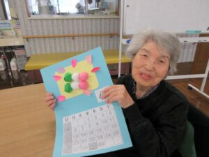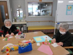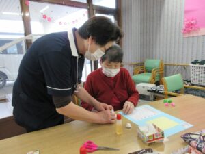 利用者さんの皆さんと一緒に、桃の花やうぐいすを画用紙等で作成し、長く切った毛糸に張り付け、壁に吊るして飾りました。皆さん真剣で黙々と行われ、あっという間に完成しました。お雛様も飾り、一段と春らしくなりました。まだまだ寒い日が続いていますが、春の訪れが待ち遠しいです。
